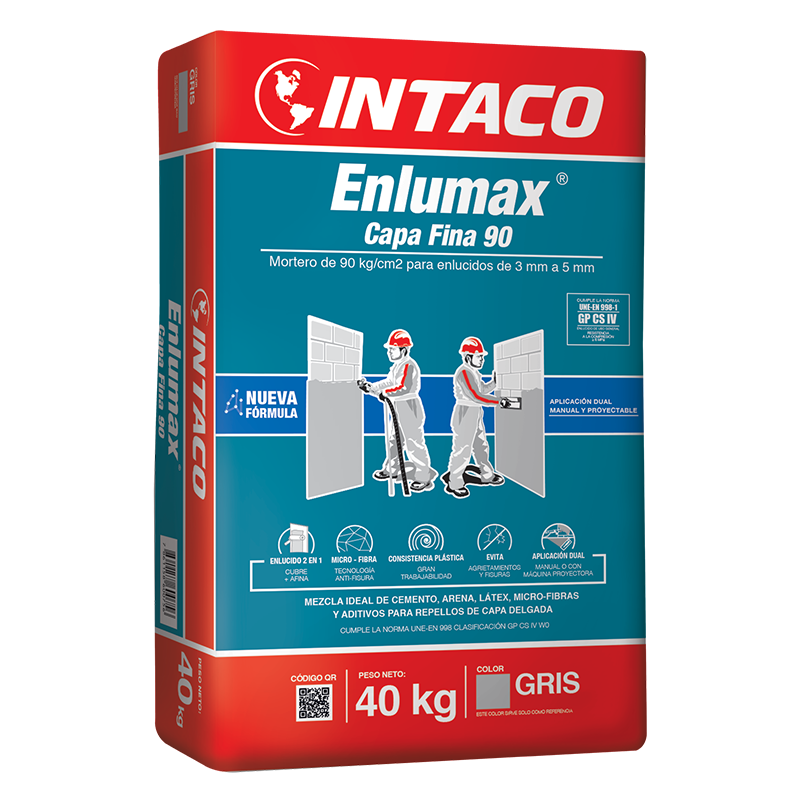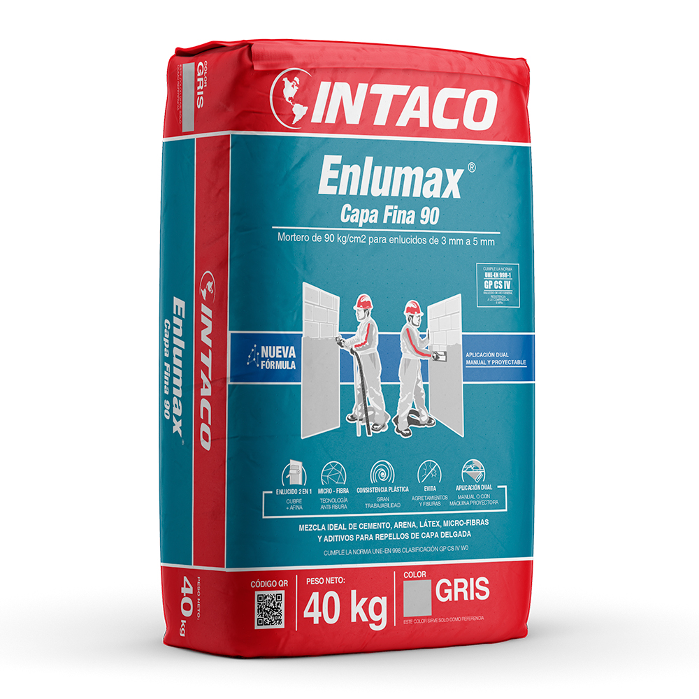 Enlumax® Capa Fina 90 es un mortero para enlucidos de 3 mm a 5 mm, modificado con látex, microfibras y aditivos, de aplicación manual o con máquina proyectora